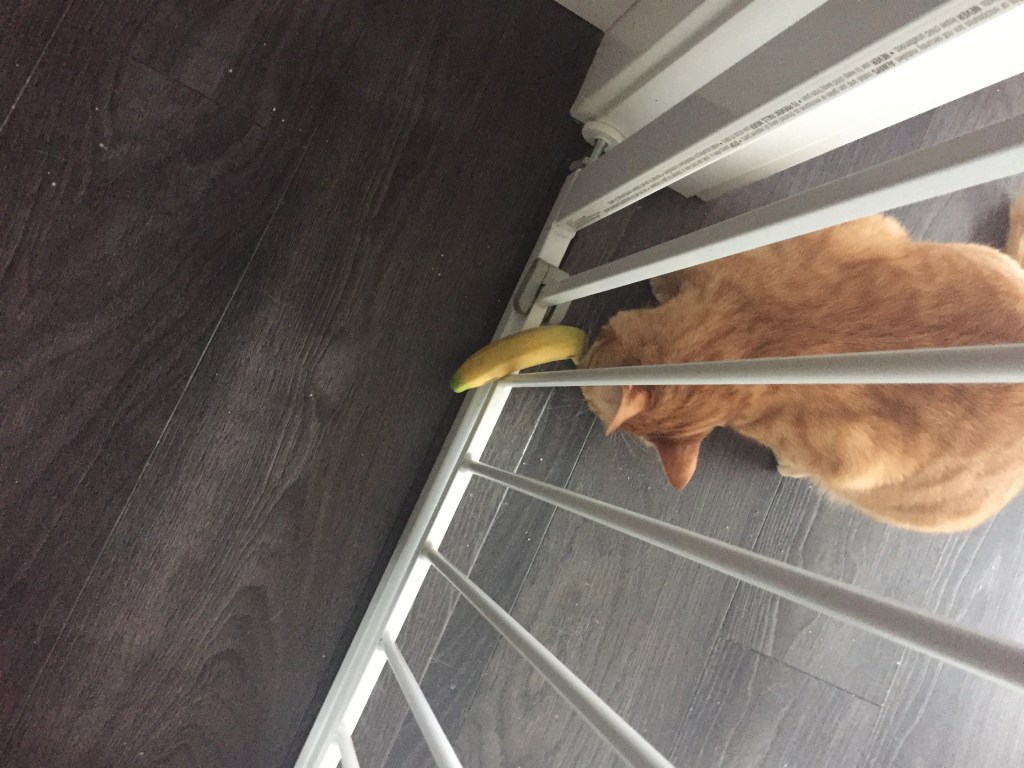 Bobo is a banana thief. I was minding my own business and heard an obscure bump bump in the hallway. This week we bought the small bananas at the grocery store because I like them. Apparently they are the perfect size for a banana bandit. It must be terrifying for a small banana, to be carried around the house by a banana bandit.