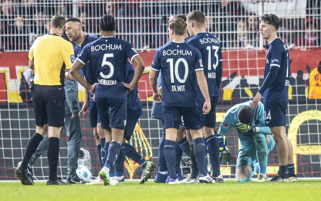 With the game in stoppage time and Union pushing, Patrick Drewes was hit by what appeared to be a cigarette lighter, with the refree ordering the players off the pitch.