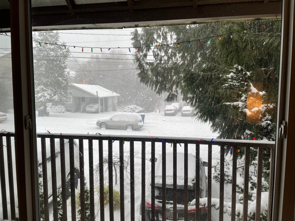 When he tires of the ups and downs, we walk outside and watch the trains come and go from the Seattle transit system.